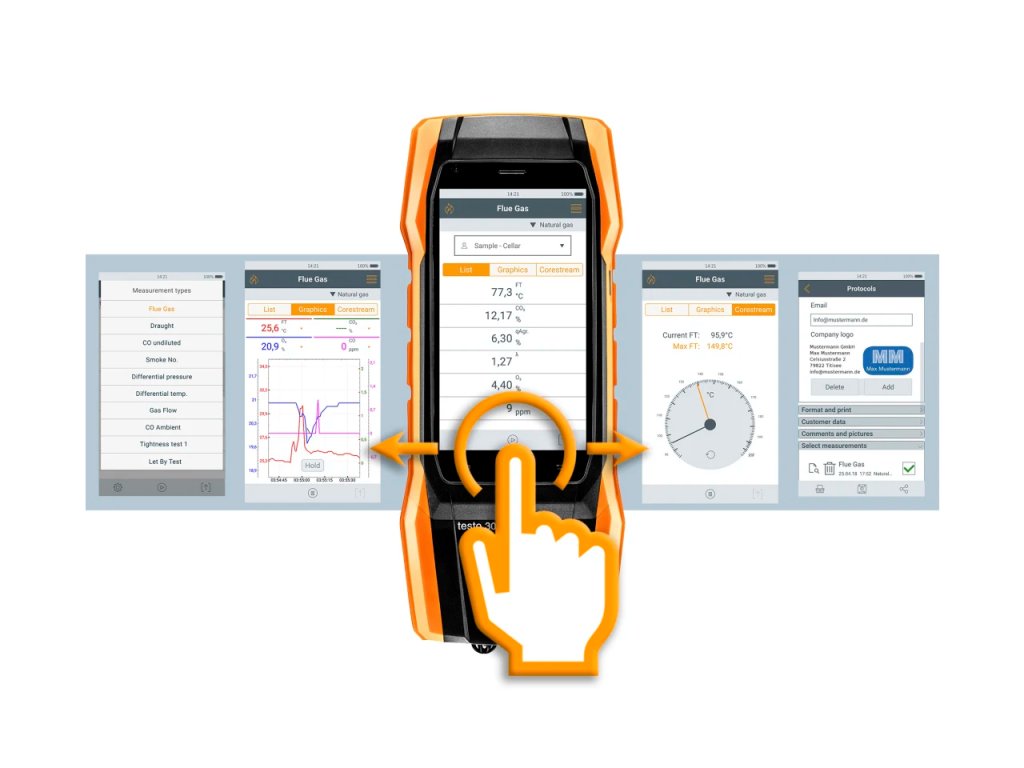 - Chytrý dotykový displej pro intuitivní ovládání analyzátoru spalin: displej odpovídá bez odezvy - stejně snadné jako na vašem chytrém telefonu