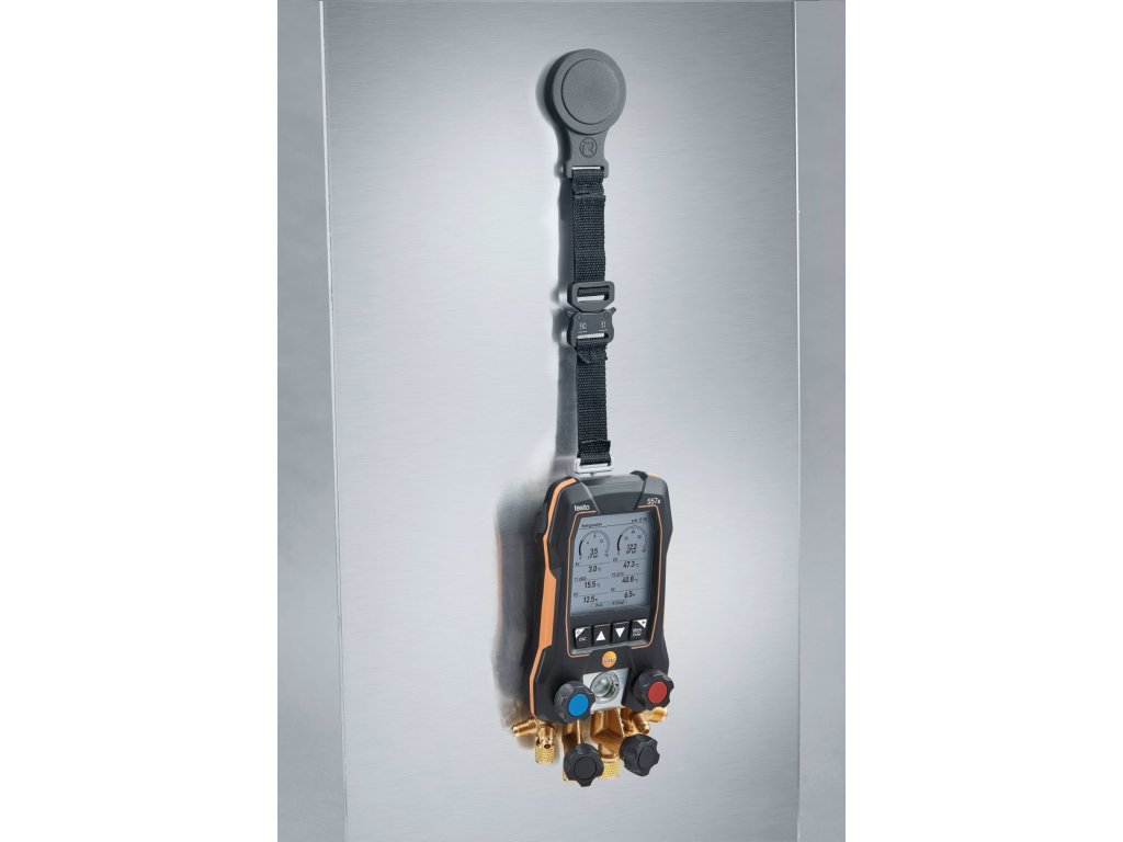 Pomocí magnetického popruhu upevníte servisní přístroj rychle a bezpečně na kovové povrchy, například na chladicích a klimatizačních systémech a tepelných čerpadlech. Díky jednoduchému zacvakávacímu systému můžete k zavěšení servisního přístroje použít háček nebo magnet - servisní přístroj je možné snadno připojit k jakémukoliv systému a při měření budete mít obě ruce volné.