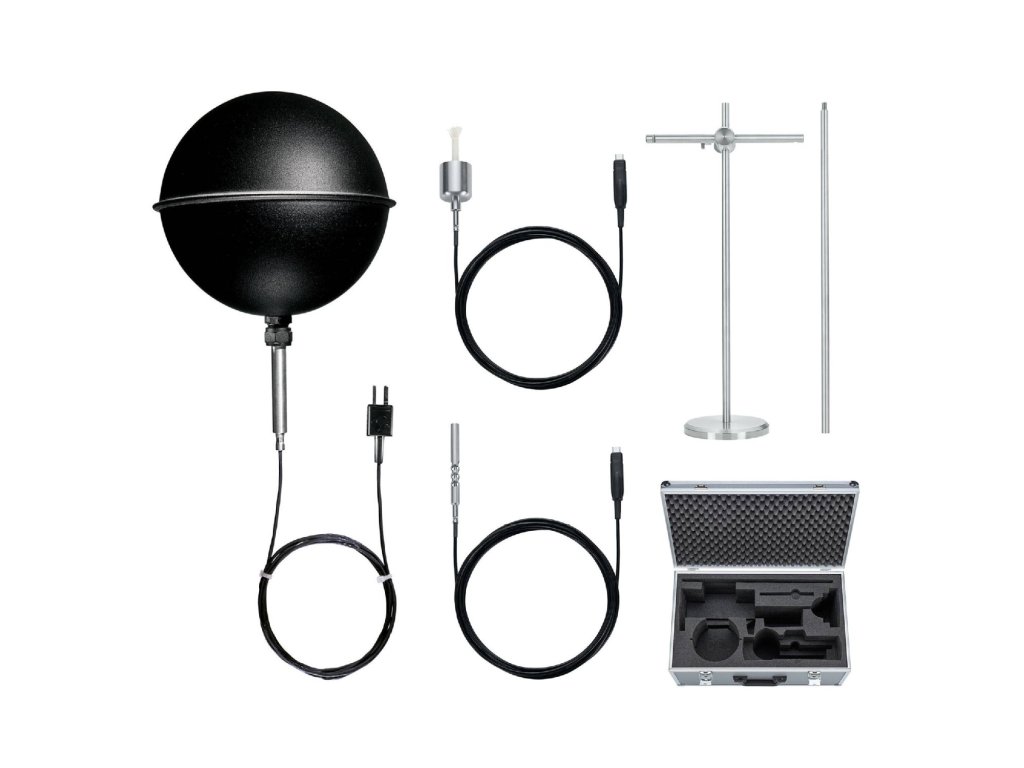 - V sadě: kulový teploměr (TE typ K), sonda pro měření okolní teploty a vlhkostně-teplotní sonda (obě Pt100), stativ a kufr