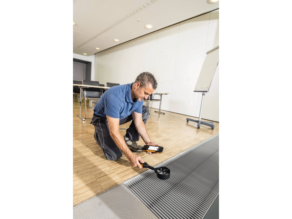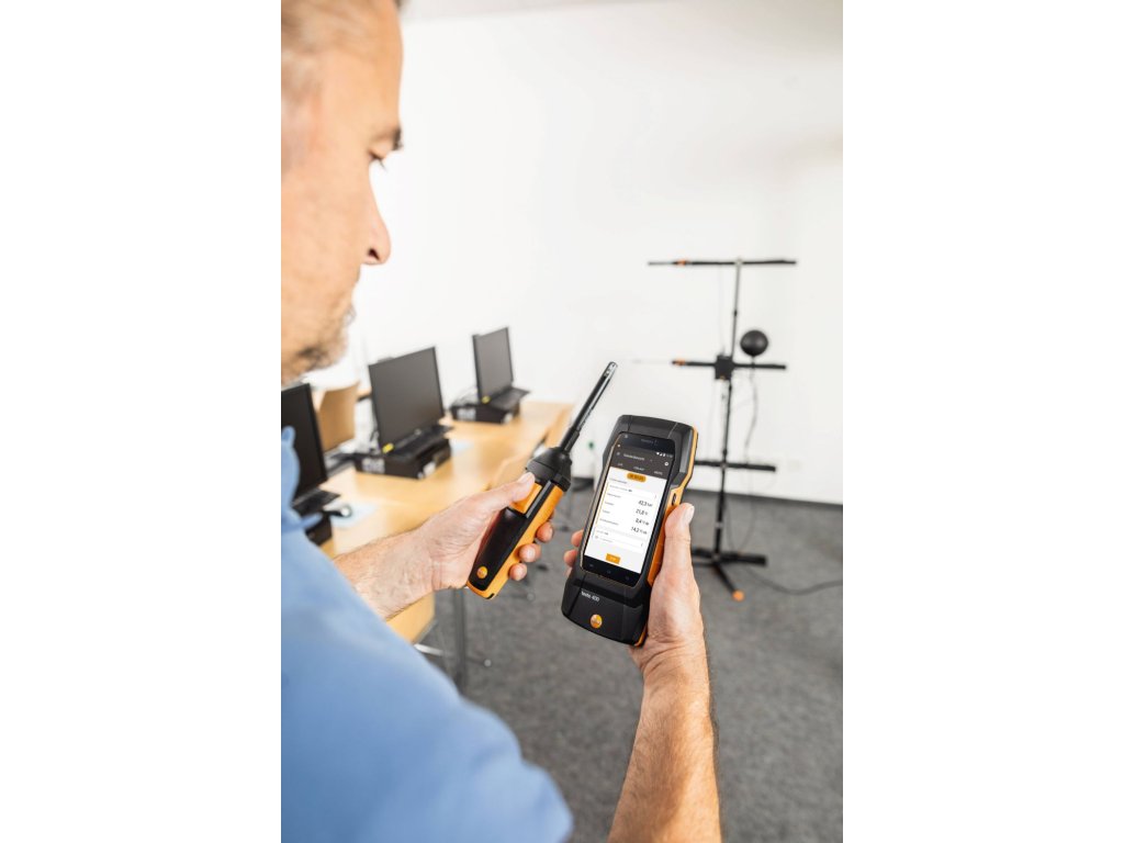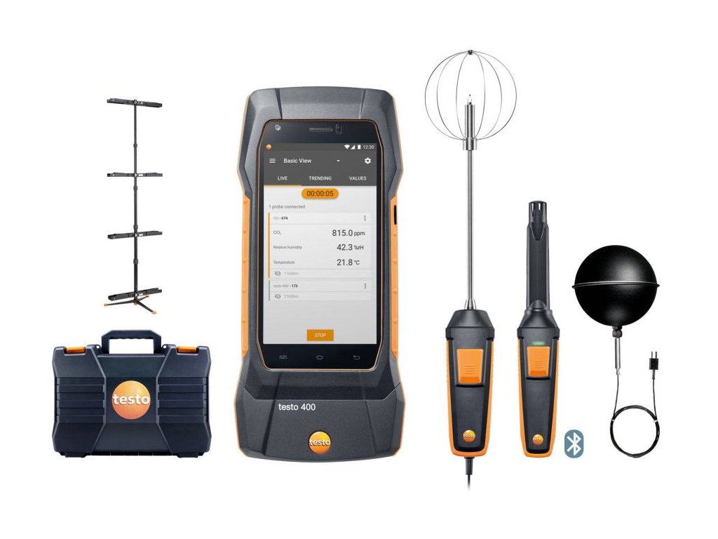 - V sadě: univerzální přístroj testo 400 pro měření klimatických veličin, sonda CO2 (s Bluetooth®) rukojetí, sonda pro měření stupně turbulence s kabelem, kulová sonda (Ø 150 mm) s kabelem, stativ pro měření s brašnou, kufr