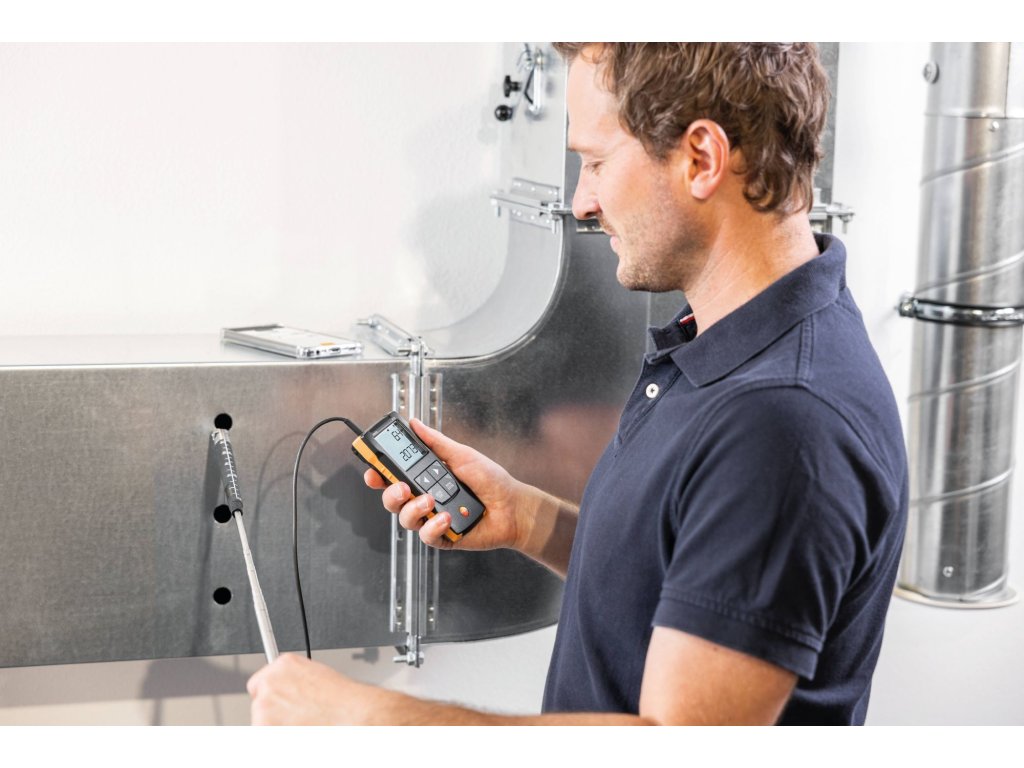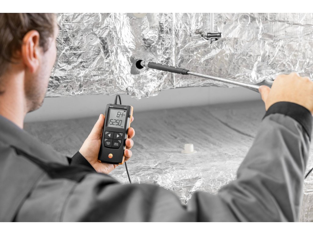 S kompaktním vrtulkovým anemometrem testo 416 s 16mm vrtulkou v kombinaci s teleskopickou sondou a možností připojení k aplikaci můžete snadno, rychle a přesně měřit proudění v kanálech klimatizačních a ventilačních systémů. Integrovaný teleskop lze vysunout až do délky 850 mm, což Vám usnadňuje práci nad hlavou nebo v kanálech o velkém průměru. Abyste měli všechny důležité informace po ruce, testo 416 automaticky vypočítá časové a bodové střední hodnoty i objemový průtok. A díky kompaktnímu provedení a odolnému pouzdru obstojí tento vrtulkový anemometr i v případech, kdy je občas pracovat v trochu náročnějších podmínkách.