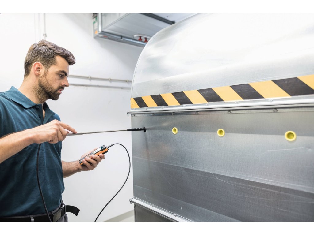 Sada pro měření na vzduchových vyústkách: přístroj pro měření klimatických veličin testo 440 a vrtulkovou sondu (Ø 100 mm) s Bluetooth vč. teplotního senzoru dostanete bezpečně uloženou v kufru. Tak můžete se svojí prací rovnou začít!