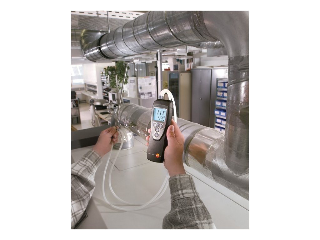 Diferenční tlakoměr se také optimálně hodí pro měření s Prandtlovou trubicí ve ventilačním kanálu při zvláště vysokých rychlostech proudění nebo silně znečištěném proudění. Zobrazí jak tlak tak také rychlost proudění. Měřicí rozsah pro rychlosti proudění je mezi 2 a 17,5 m/s.