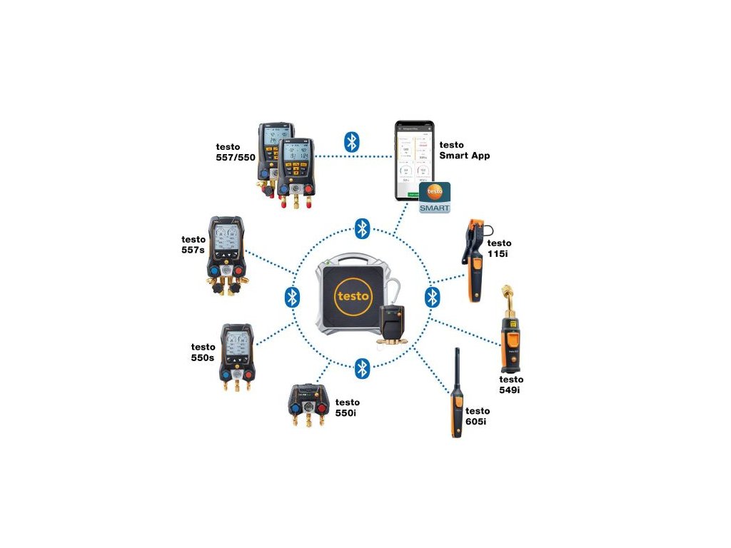 - Kompatibilní s digitálními servisními přístroji testo 557s/550s/550i a také testo 557/550, chytrými sondami testo 115i / 549i/605i, aplikací testo Smart App pro Android a iOS